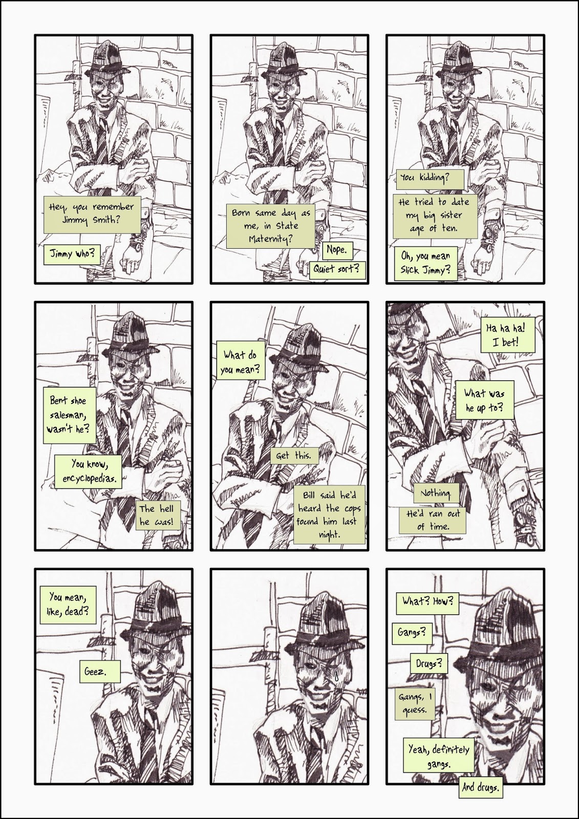 Another of the “One Page Wonder” series, with the added constraint of repeating the same picture on every page. Repetition’s a powerful device in comics, this takes it to extremes. The tear in his eye was inspired by one of Scott McCloud’s morning improv strips, which itself uses repetition to stunning effect.