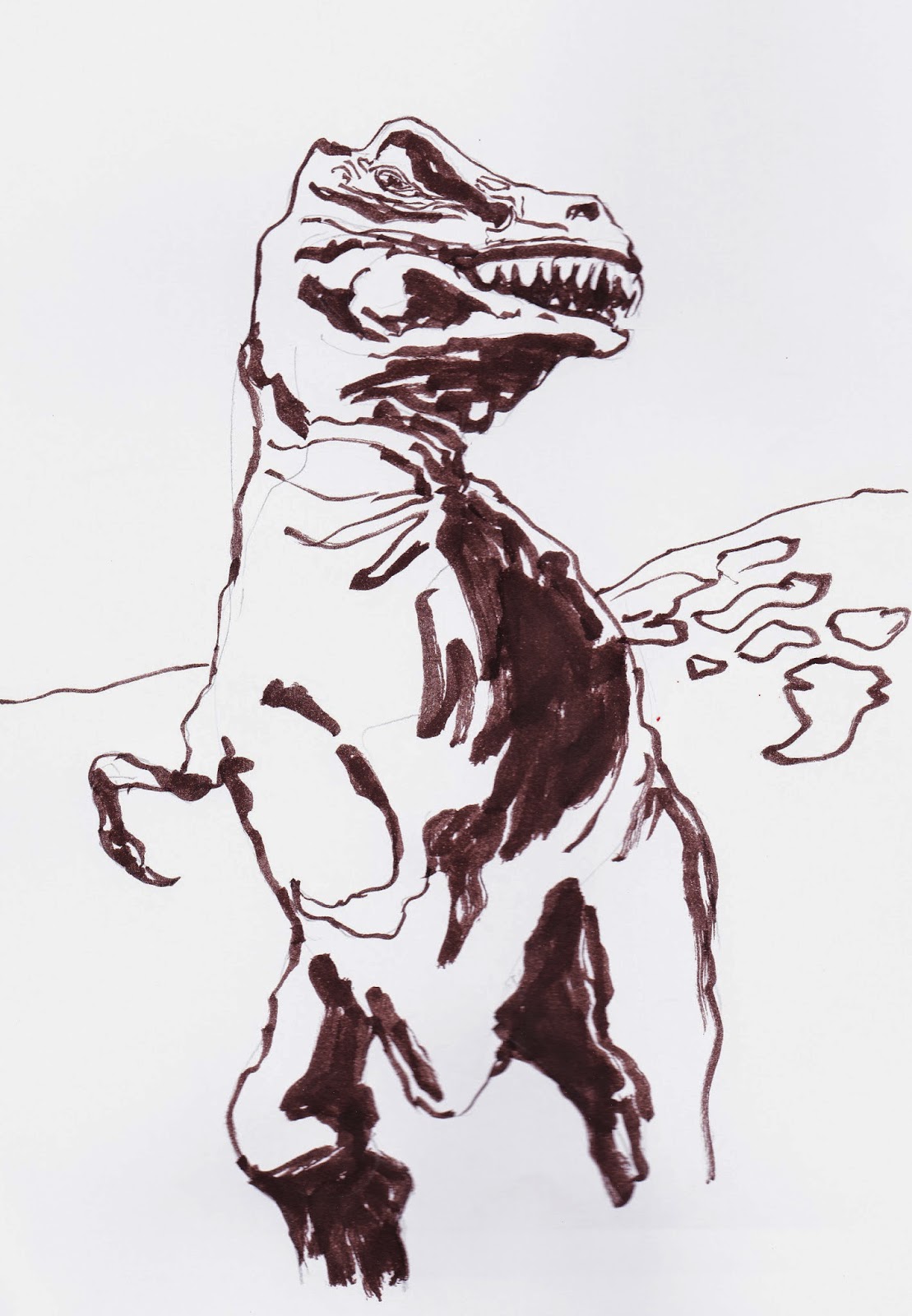 Peteinosaur was drawn mostly with Pitt Pens, and a lot of fussy detail, the T Rex with a Pentel Pocket Brush, in broad, amorphous shadows and fluid lines. Nice contrast between the effects achievable with the two types of pen.