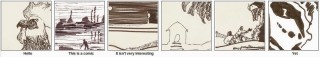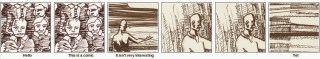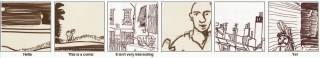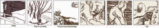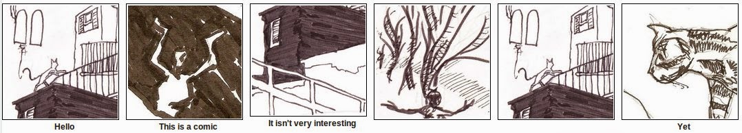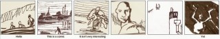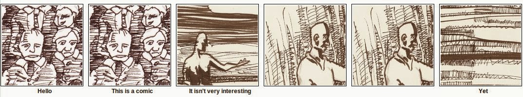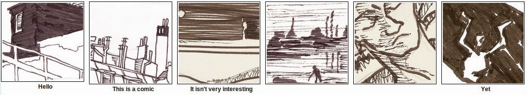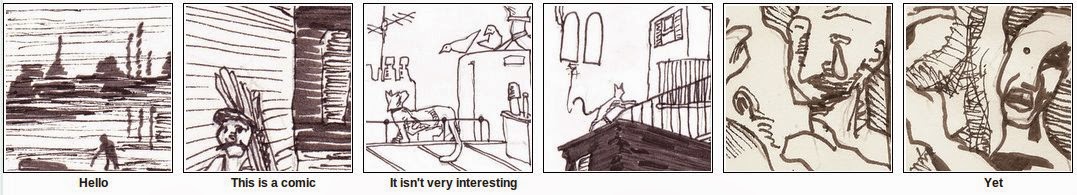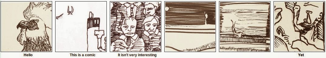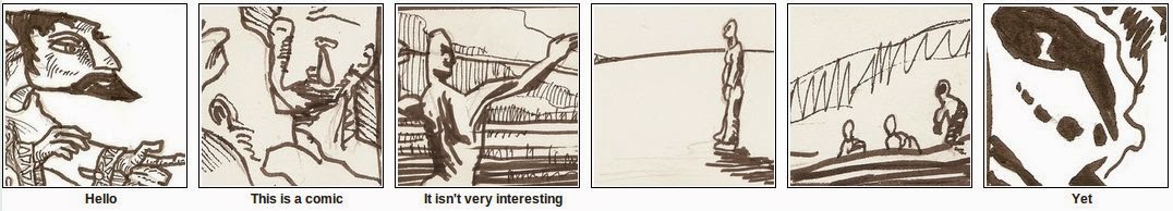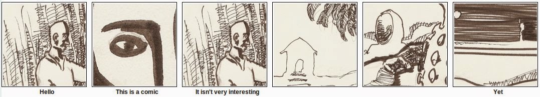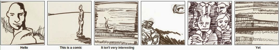 When I’m not doing comics, I’m often found doing code. Here’s an experiment that combines the two. I’ve cut out 42 roughly equal-sized panels from drawings that I’ve done, and randomly recombined them on top of a six panel script. Look at how the words and pictures dance together, and modify each other’s meanings!