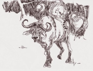 A genet (a cat-like animal) has been caught on auto-triggering infra-red night camera riding on the backs of buffalo and rhino, behaviour never observed before. I wonder what they’re both thinking?