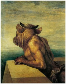 It’s ghost story time, time to pass on things that go bump and all that. The picture above, George Frederic Watt’s Minotaur, was used as an illustration in a book called “Murray’s Manual of Mythology” that was in my parents’ house when I was little. My brother and I were devouring this book at an early age, but this picture always scared te heck out of me. I remember daring myself to look at it in daylight, then really wishing I hadn’t as it got dark. Quite often. I found it online a few days ago, and haven’t seen it for years before that – I misremembered the image as being of the creature sat at a table with it’s knife and fork ready. I’d often look at the book, being drawn to that page – in the kitchen, getting under my mother’s feet in an attempt to not be too alone. The picture captures something of the bovine stupidity of the creature, and I think that that’s what scared me about it – it’s realistic, not just in the outward rendering of the painting, but the personality.