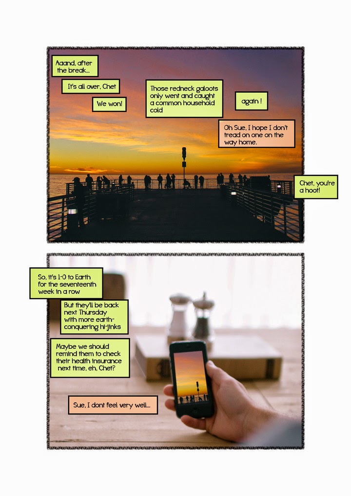 Yet another unsplash email into my inbox… nothing deep this time, just funning around, and focussing on the dialog. Enjoy! Big thanks to Jonathan Velasquez Ramiro Checchi Sven Schlager davide ragusa (twice) Greg Shield Gabriel Santiago Kim Daniel Volkan Olmez for some really beautiful images to work with, and the cosmic Dr Mike 2000’s sprawling saga Universe Gun, who’s writing inspired the banter between the Chet & Sue characters in this strip.