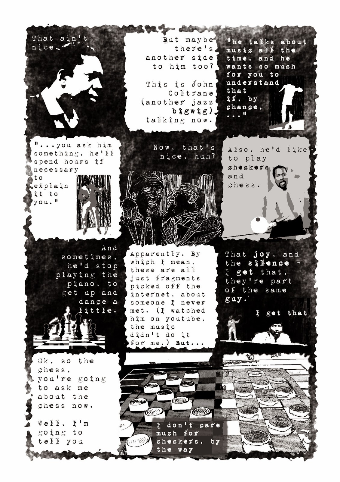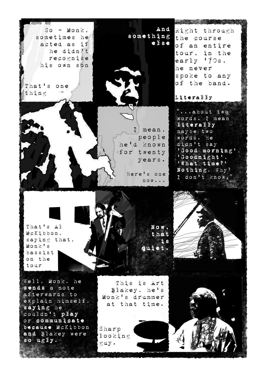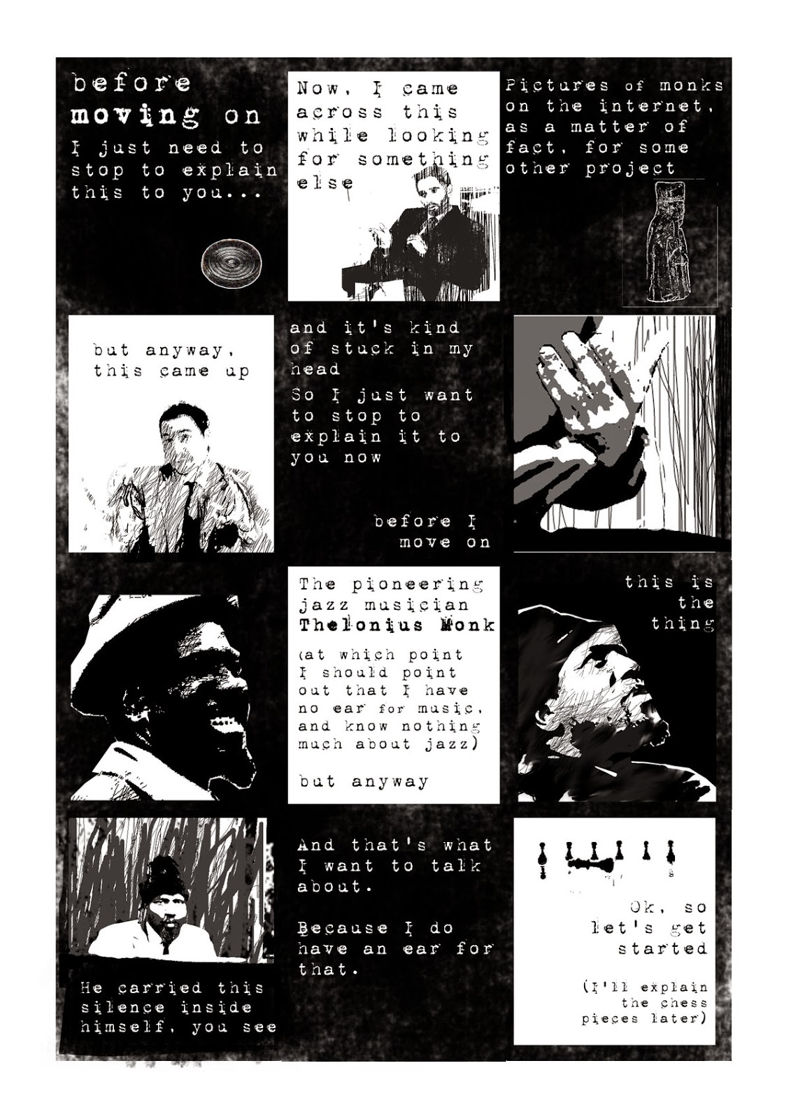 I genuinely do know very little about Thelonius Monk, and stumbled upon his story online on wikipedia, while looking for visual refs for something else. The rest of the narrative descends quickly into fiction, though (or, at least, the narrative voice is no longer an account of my thoughts or feelings).