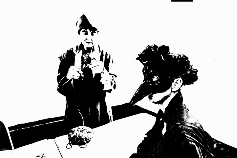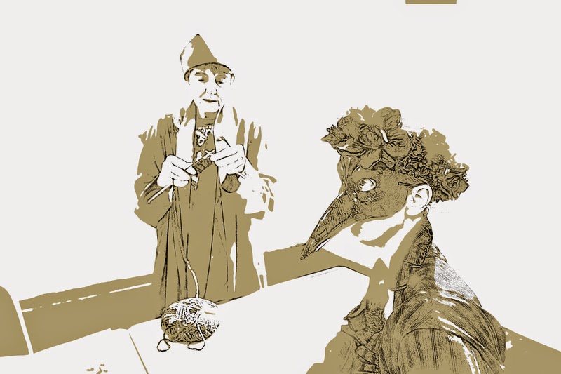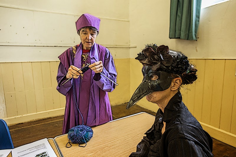 Here’s the starting point, an “out-take” photo of Liz (left, knitting) and Karen (right, with mask on) – on the days that we were doing the photo-shoots, all the photographers were taking snaps pretty much flat out, as anything could end up as a panel.