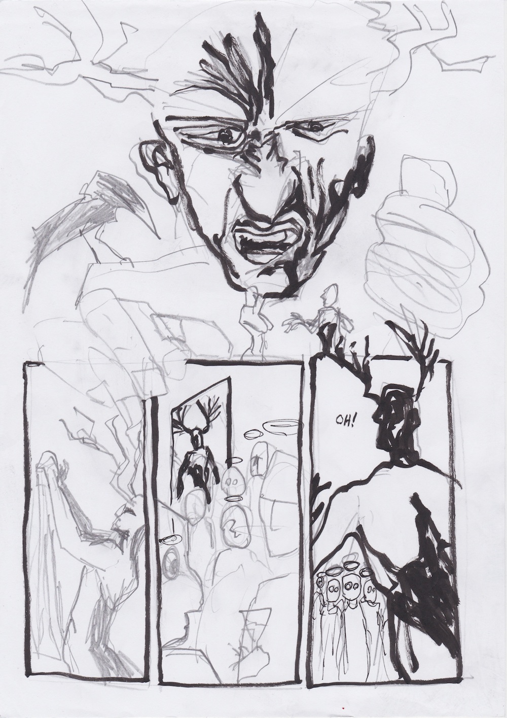 The sketch below (rough mix of 2B pencil, Pitt Pen and Pocket Brush) was from a quick exercise that we did, in which a storyline was revealed panel by panel for us to draw – quickly, without thinking too much about it. a riff on the usual “angry person – angry person dresses up – goes to party – wrong sort of party” journey, you know. It was great seeing everyone’s different interpretations of this, ranging from the cartoony to expressionist to downright strange. If you work out what my one’s meant to be about, let me know, eh?