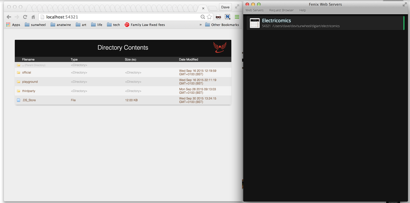 Fenix is a user friendly web server with a graphical user interface. After installing it, run the app, and set up a new web server with whatever name you like, and pick a “port number” – I’ve gone for the whimsical ‘54321’ (if you don’t know port numbers, stick with that, it’s probably OK on all systems). The server needs a folder too – point it at the folder you unzipped your Electricomic into. Start the server you’ve created, and then open a web browser, at http://localhost:54321 (you can bookmark/favourite this to avoid typing it in every time). Here’s Fenix and the web browser running side by side.