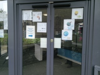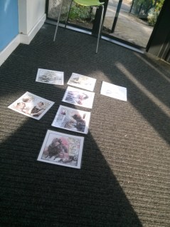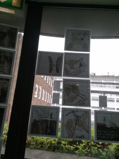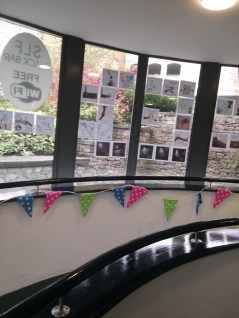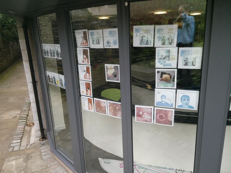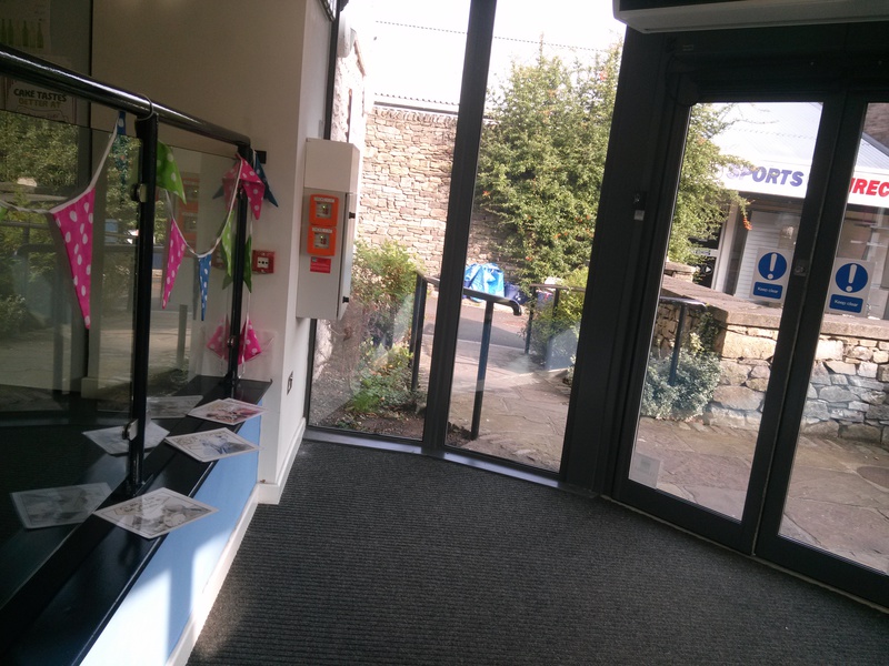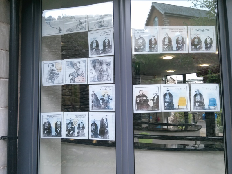 I’ve been in Kendal today, at the Foyer Cafe run by YWCA Kendal, installing my exhibition (twice! “Washable” glue-spots didn’t do the job, so I had to re-stick everything with “extra strong” after they started falling like little autumn leaves. The blobs are transparent, but just about visible from outside – special prize to the person who tells me which panel has the most blobs on it!)