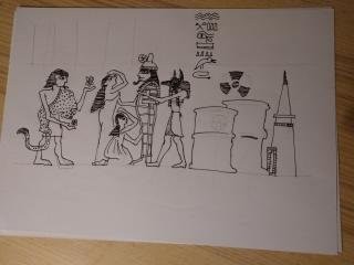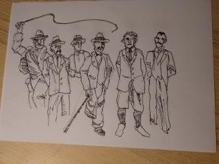 Pen and ink sketches for a piece about nuclear waste management and the climate crisis. Third from right in the group of people is Howard Carter, the adventurer/archaeologist on whom movie hero Indiana Jones (left) was loosely based.